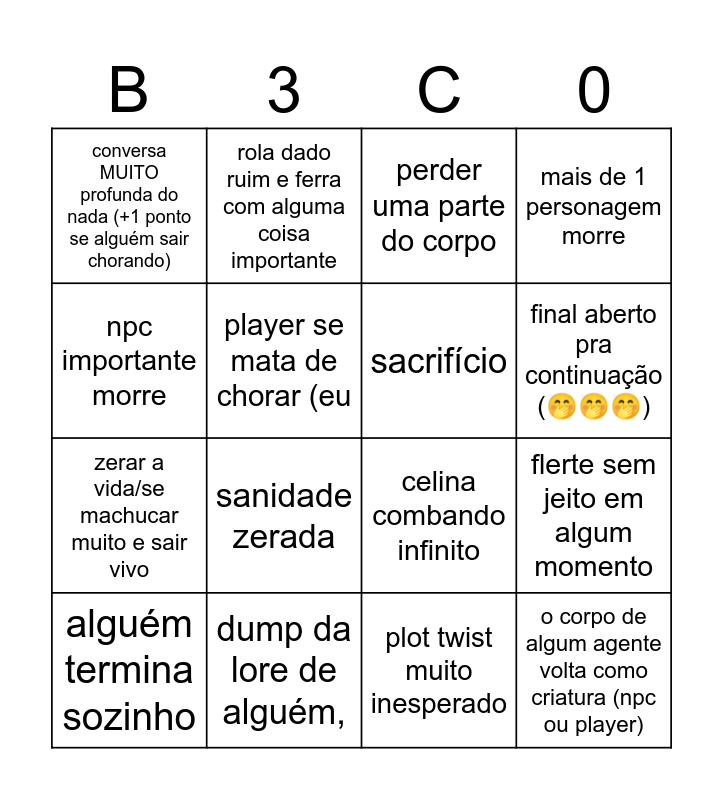 This bingo card has 16 words: dump da lore de alguém,, flerte sem jeito em algum momento, perder uma parte do corpo, conversa MUITO profunda do nada (+1 ponto se alguém sair chorando), zerar a vida/se machucar muito e sair vivo, rola dado ruim e ferra com alguma coisa importante, celina combando infinito, plot twist muito inesperado, npc importante morre, player se mata de chorar (eu, alguém termina sozinho, mais de 1 personagem morre, sanidade zerada, final aberto pra continuação (🤭🤭🤭), sacrifício and o corpo de algum agente volta como criatura (npc ou player).