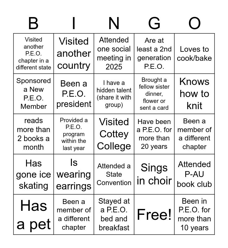 This bingo card has 30 words: Been a member of a different chapter, P.E.O. Officer Current or Prior, Provided a P.E.O. program within the last year, Are wearing a P.E.O. pin today, Visited another P.E.O. chapter in a different state, Attended one social meeting in 2025, Been a P.E.O. president, Attended a State Convention, Have been a P.E.O. for more than 20 years, Stayed at a P.E.O. bed and breakfast, Been a member of a different chapter, Visited Cottey College, Free!, Been in P.E.O. for more than 10 years, Knows how to knit, Chooses Salty over sweet, Sings in choir, Has gone ice skating, Is wearing earrings, Loves to cook/bake, reads more than 2 books a month, Born in April, May, June, Visited another country, Brought a fellow sister dinner, flower or sent a card, Sponsored a New P.E.O. Member, Are at least a 2nd generation P.E.O., Attended P-AU book club, Has a pet, I have a hidden talent (share it with group) and Has someone they want to introduce to P.E.O..