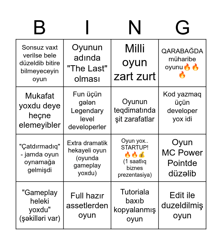 This bingo card has 16 words: Full hazır assetlerden oyun, Oyun MC Power Pointde düzəlib, Milli oyun zart zurt, Sonsuz vaxt verilse bele düzeldib bitire bilmeyeceyin oyun, "Çatdırmadıq" - jamda oyun oynamağa gelmişdi, Oyunun adında "The Last" olması, Oyun yox.. STARTUP! 🔥🔥💰 (1 saatlıq biznes prezentasiya), Tutoriala baxıb kopyalanmış oyun, Mukafat yoxdu deye heçne elemeyibler, Fun üçün gələn Legendary level developerler, "Gameplay heleki yoxdu" (şəkilləri var), QARABAĞDA müharibe oyunu🔥🔥🔥, Extra dramatik hekayeli oyun (oyunda gameplay yoxdu), Kod yazmaq üçün developer yox idi, Oyunun teqdimatında şit zarafatlar and Edit ile duzeldilmiş oyun.