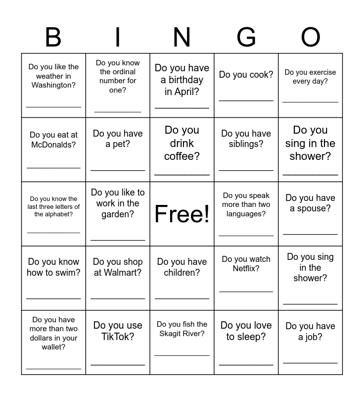 This bingo card has a free space and 24 words: Do you shop at Walmart? ___________, Do you use TikTok? __________, Do you drink coffee? _________, Do you have more than two dollars in your wallet? _____________, Do you exercise every day? ______________, Do you like the weather in Washington? _____________, Do you eat at McDonalds? ____________, Do you know the ordinal number for one? ___________, Do you speak more than two languages? _____________, Do you have children? ___________, Do you have siblings? ___________, Do you know the last three letters of the alphabet? _______________, Do you watch Netflix? ____________, Do you sing in the shower? ___________, Do you have a pet? ___________, Do you love to sleep? __________, Do you have a spouse? ___________, Do you have a birthday in April? __________, Do you sing in the shower? _________, Do you like to work in the garden? ___________, Do you have a job? ___________, Do you know how to swim? ___________, Do you cook? ___________ and Do you fish the Skagit River? _____________.