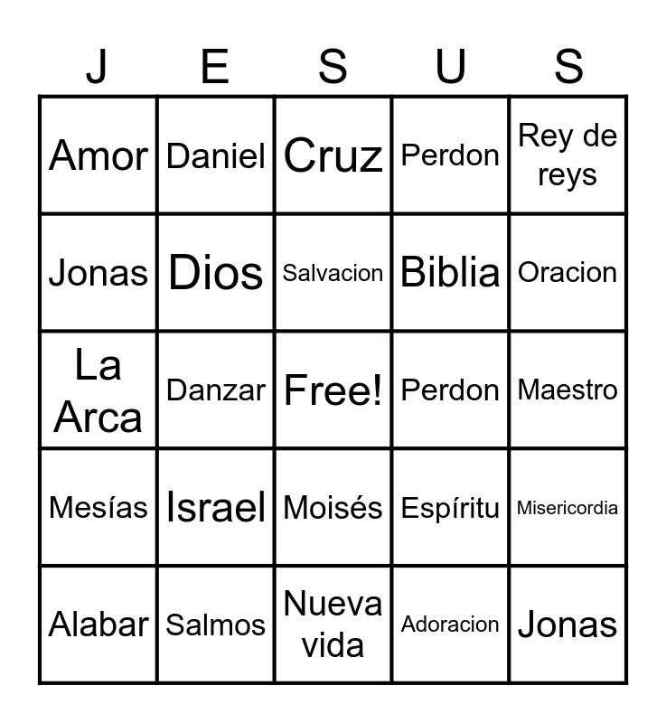 This bingo card has a free space and 29 words: David, Salmos, Cruz, Cielo, Rey de reys, Amor, Dios, Salvacion, Perdon, Misericordia, Alabar, Danzar, Adoracion, Jonas, La Arca, Milagros, Nueva vida, Espíritu, Oracion, Mesías, Israel, Cristo, Biblia, Maestro, Jonas, Daniel, Moisés, Perdon and Gozo.