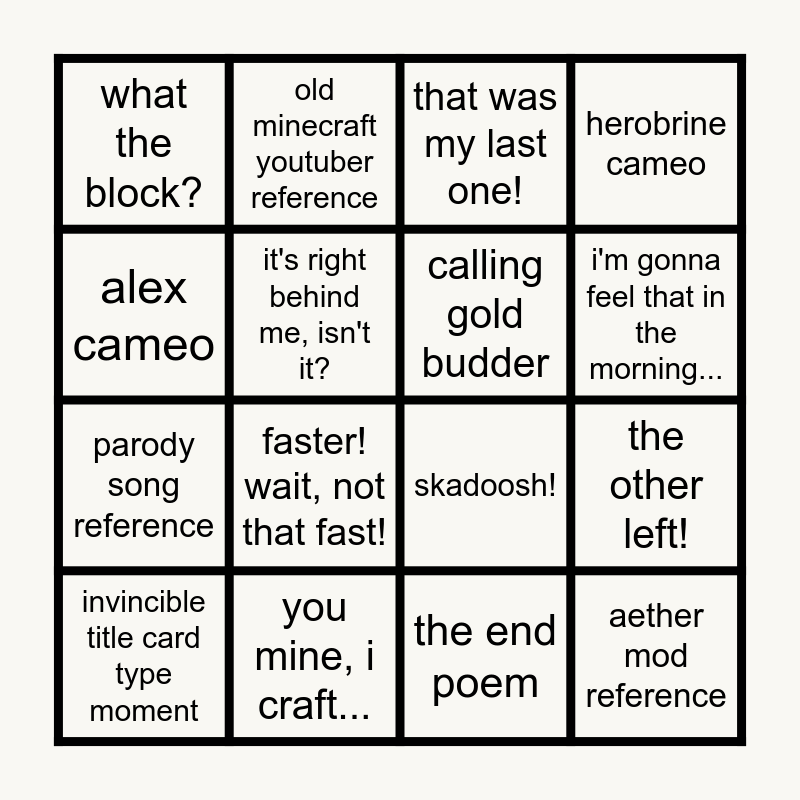 This bingo card has 16 words: you mine, i craft..., the other left!, that was my last one!, what the block?, parody song reference, old minecraft youtuber reference, skadoosh!, the end poem, alex cameo, it's right behind me, isn't it?, invincible title card type moment, herobrine cameo, faster! wait, not that fast!, i'm gonna feel that in the morning..., calling gold budder and aether mod reference.