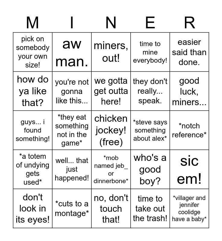 This bingo card has a free space and 24 words: well... that just happened!, *cuts to a montage*, we gotta get outta here!, don't look in its eyes!, easier said than done., pick on somebody your own size!, how do ya like that?, aw man., *steve says something about alex*, *mob named jeb_ or dinnerbone*, they don't really... speak., guys... i found something!, who's a good boy?, sic em!, you're not gonna like this..., time to take out the trash!, *notch reference*, miners, out!, good luck, miners..., *they eat something not in the game*, *villager and jennifer coolidge have a baby*, *a totem of undying gets used*, time to mine everybody! and no, don't touch that!.