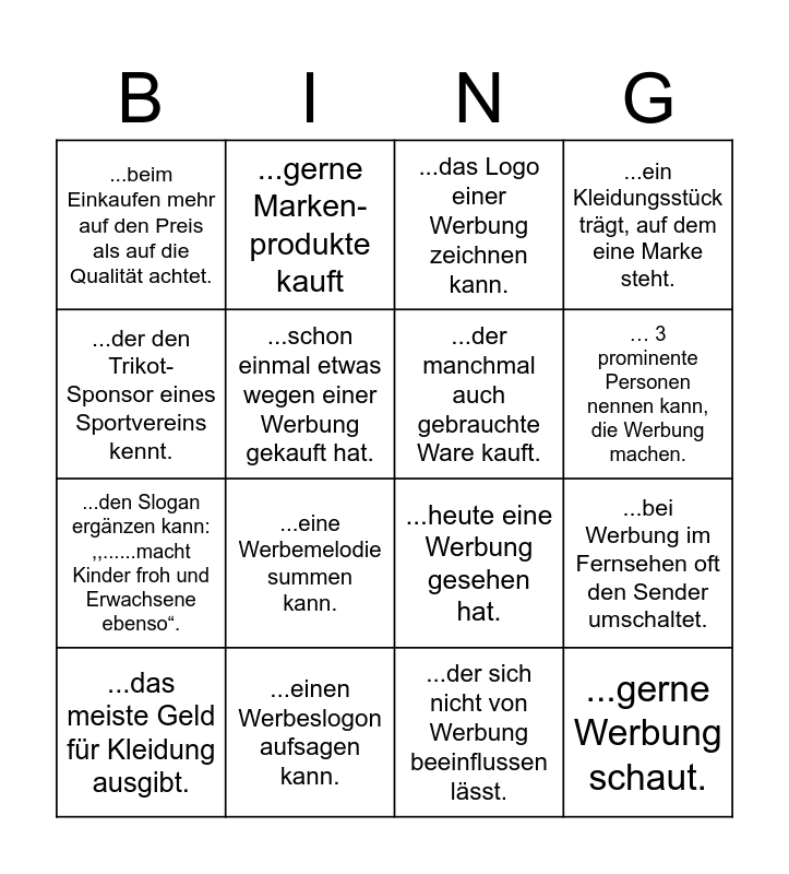 This bingo card has 16 words: ...einen Werbeslogon aufsagen kann., ...bei Werbung im Fernsehen oft den Sender umschaltet., ...das Logo einer Werbung zeichnen kann., ...beim Einkaufen mehr auf den Preis als auf die Qualität achtet., ...den Slogan ergänzen kann: ,,......macht Kinder froh und Erwachsene ebenso“., ...gerne Marken- produkte kauft, ...heute eine Werbung gesehen hat., ...der sich nicht von Werbung beeinflussen lässt., ...der den Trikot-Sponsor eines Sportvereins kennt., ...schon einmal etwas wegen einer Werbung gekauft hat., ...das meiste Geld für Kleidung ausgibt., ...ein Kleidungsstück trägt, auf dem eine Marke steht., ...eine Werbemelodie summen kann., … 3 prominente Personen nennen kann, die Werbung machen., ...der manchmal auch gebrauchte Ware kauft. and ...gerne Werbung schaut..