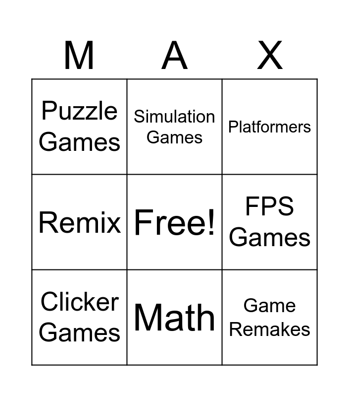 This bingo card has a free space and 8 words: FPS Games, Platformers, Simulation Games, Clicker Games, Puzzle Games, Game Remakes, Remix and Math.