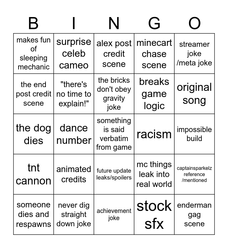 This bingo card has a free space and 24 words: someone dies and respawns, animated credits, the bricks don't obey gravity joke, stock sfx, streamer joke /meta joke, makes fun of sleeping mechanic, surprise celeb cameo, alex post credit scene, racism, impossible build, the dog dies, "there's no time to explain!", mc things leak into real world, captainsparkelz reference /mentioned, the end post credit scene, never dig straight down joke, achievement joke, minecart chase scene, original song, tnt cannon, dance number, future update leaks/spoilers, breaks game logic and enderman gag scene.
