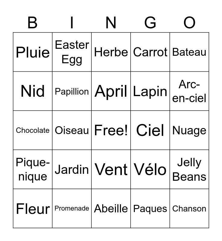 This bingo card has a free space and 29 words: Fleur, Soleil, Oiseau, Arbre, Pluie, Herbe, Papillion, Jardin, Ciel, Promenade, Nuage, Chanson, Abeille, Paques, Arc-en-ciel, Saison, Vent, Pique-nique, Bateau, Chocolate, Vélo, Canard, Lapin, Nid, Carrot, Easter Egg, Jelly Beans, April and Basket.