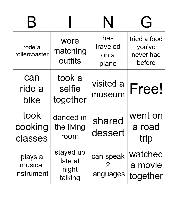 This bingo card has 18 words: danced in the living room, watched a movie together, has traveled on a plane, rode a rollercoaster, shared dessert, tried a food you've never had before, plays a musical instrument, wore matching outfits, Free!, took cooking classes, can speak 2 languages, can ride a bike, went on a road trip, took a selfie together, visited a museum, went star gazing, stayed up late at night talking and sang karaoke.