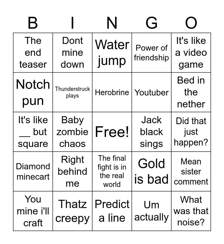 This bingo card has a free space and 24 words: Right behind me, Thatz creepy, Herobrine, You mine i'll craft, It's like a video game, The end teaser, Notch pun, Dont mine down, Jack black sings, The final fight is in the real world, Youtuber, It's like __ but square, Gold is bad, Mean sister comment, Thunderstruck plays, Um actually, Did that just happen?, Water jump, Bed in the nether, Baby zombie chaos, What was that noise?, Diamond minecart, Power of friendship and Predict a line.