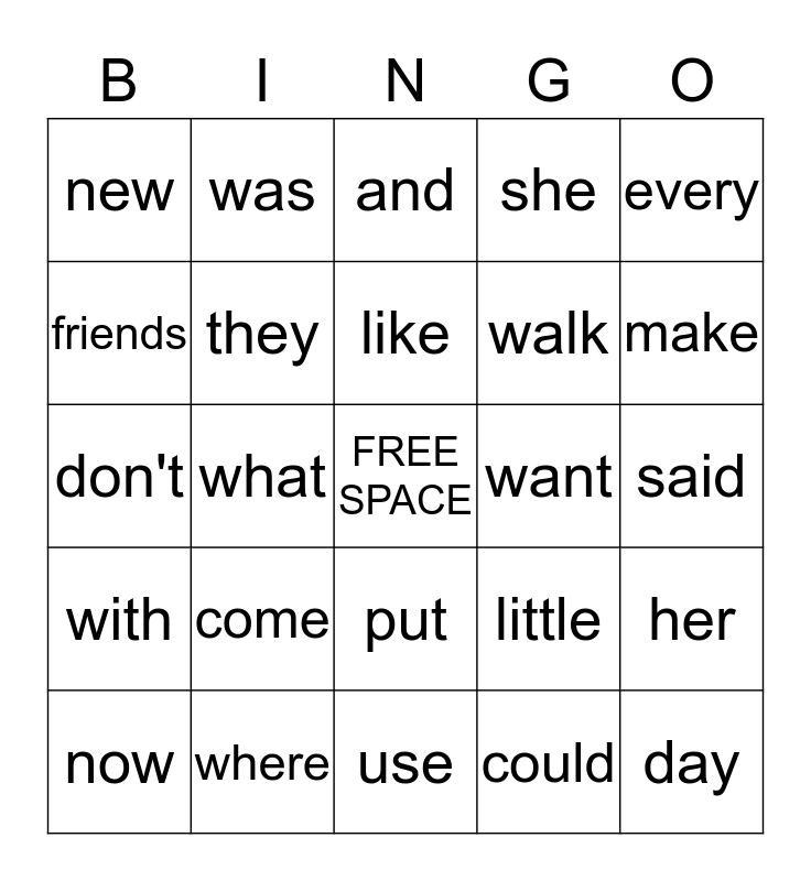This bingo card has a free space and 24 words: come, where, like, now, every, new, friends, was, want, put, walk, don't, little, her, they, could, said, and, make, what, day, with, she and use.