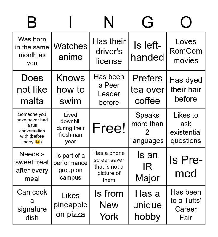 This bingo card has a free space and 24 words: Is part of a performance group on campus, Likes pineapple on pizza, Has been a Peer Leader before, Can cook a signature dish, Loves RomCom movies, Was born in the same month as you, Does not like malta, Watches anime, Speaks more than 2 languages, Has a phone screensaver that is not a picture of them, Prefers tea over coffee, Someone you have never had a full conversation with (before today 😉), Is an IR Major, Is Pre-med, Knows how to swim, Has a unique hobby, Likes to ask existential questions, Has their driver's license, Has dyed their hair before, Lived downhill during their freshman year, Has been to a Tufts' Career Fair, Needs a sweet treat after every meal, Is left-handed and Is from New York.