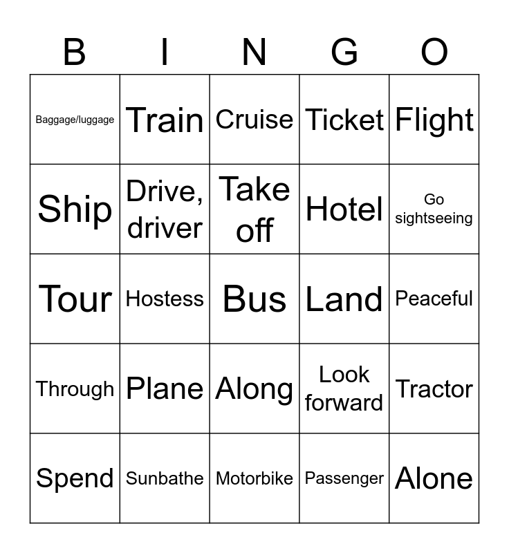 This bingo card has 47 words: Ferry, Bus, Helicopter, Motorbike, Plane, Taxi, Train, Tram, Ship, Lorry/truck, Drive, driver, Ticket, Tractor, Look forward, To book, Pack, Take off, Land, Take pictures, Flight, Hostess, Passenger, Baggage/luggage, Hotel, Have a good time, Go sightseeing, Spend, Travel, Along, Through, In the middle of, At the top of, Between, Inside, Travel, Sunbathe, Peaceful, Cheap, Expensive, Exciting, Alone, Cruise, Tour, Trip, Voyage, Excursion and Journey.
