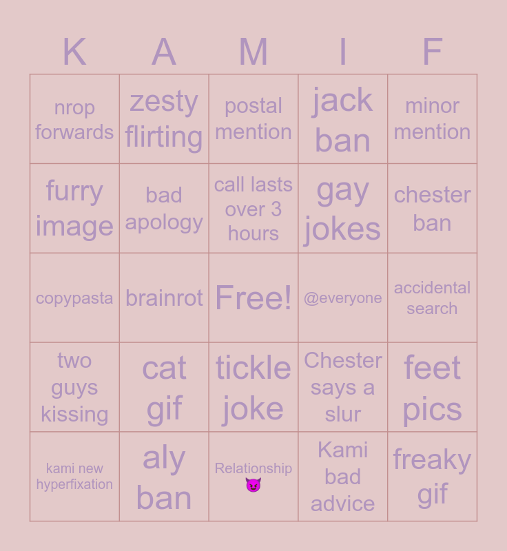 This bingo card has a free space and 27 words: Chester says a slur, Kami removes someone, gay jokes, Relationship 😈, furry image, postal mention, zesty flirting, two guys kissing, @everyone, feet pics, copypasta, jack ban, kami new hyperfixation, aly ban, chester ban, kami controversy, bad apology, call lasts over 3 hours, cat gif, nrop forwards, accidental search, Kami bad advice, brainrot, freaky gif, tickle joke, minor mention and birthday.