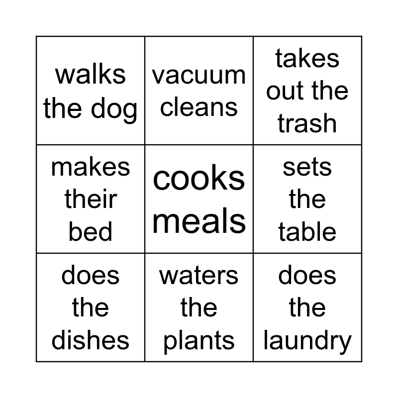 This bingo card has a free space and 8 words: sets the table, takes out the trash, vacuum cleans, does the dishes, walks the dog, does the laundry, makes their bed and waters the plants.