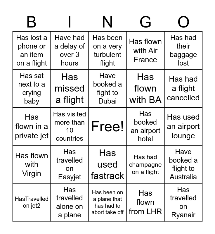 This bingo card has a free space and 29 words: HasTravelled on jet2, Has travelled business class, Has visited more than 10 countries, Has taken a domestic flight, Has lost a phone or an item on a flight, Has been on a very turbulent flight, Has missed a flight, Has travelled on Easyjet, Has booked an airport hotel, Has travelled alone on a plane, Has used an airport lounge, Has travelled on Ryanair, Has been on a plane that has had to abort take off, Has flown from LHR, Has had a flight cancelled, Has flown with EI, Has used fastrack, Has flown with Virgin, Has had their baggage lost, Has flown in a private jet, Has had champagne on a flight, Have been on a flight for longer than 10 hours, Has flown with BA, Has sat next to a crying baby, Has flown with Air France, Have had a delay of over 3 hours, Have booked a flight to Australia, Have booked a fight to Dubai and Have flown to Bucharest.