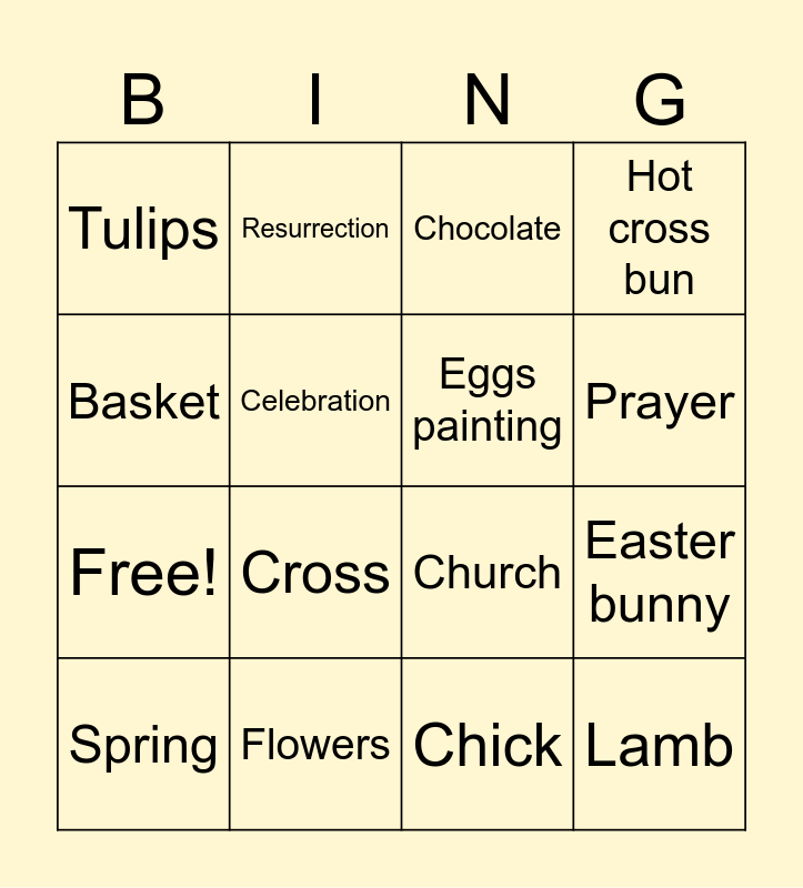 This bingo card has 20 words: Easter bunny, Eggs, Chocolate, Easter egg hunt, Spring, Basket, Flowers, Tulips, Free!, Resurrection, Cross, Church, Celebration, Lamb, Eggs painting, Bunny ears, Prayer, Hot cross bun, Chick and Bible.