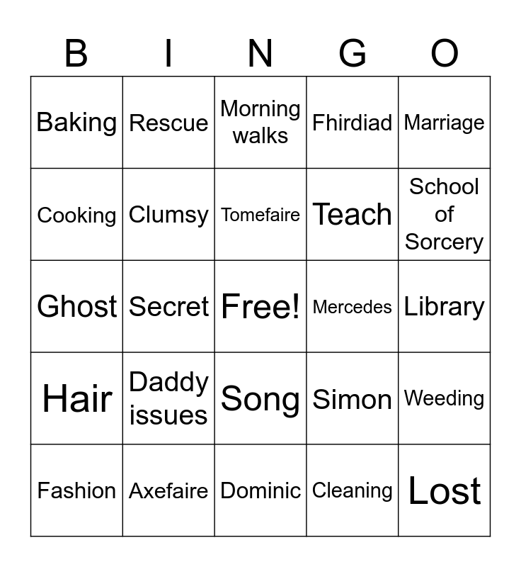 This bingo card has a free space and 24 words: Daddy issues, Axefaire, Tomefaire, Fashion, Marriage, Baking, Cooking, Rescue, Mercedes, Song, Teach, Ghost, Simon, Weeding, Clumsy, Cleaning, Library, Morning walks, School of Sorcery, Secret, Lost, Hair, Fhirdiad and Dominic.