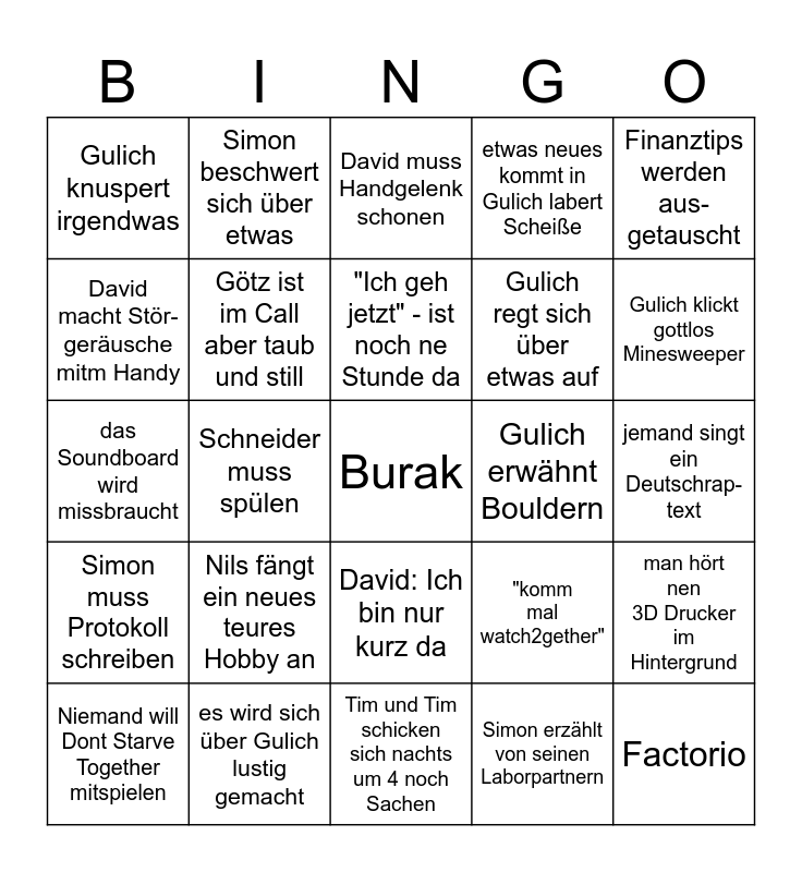 This bingo card has a free space and 24 words: Nils fängt ein neues teures Hobby an, es wird sich über Gulich lustig gemacht, "Ich geh jetzt" - ist noch ne Stunde da, Niemand will Dont Starve Together mitspielen, Finanztips werden aus-getauscht, Gulich knuspert irgendwas, David macht Stör-geräusche mitm Handy, Simon beschwert sich über etwas, Gulich erwähnt Bouldern, David: Ich bin nur kurz da, Gulich regt sich über etwas auf, das Soundboard wird missbraucht, "komm mal watch2gether", man hört nen 3D Drucker im Hintergrund, Götz ist im Call aber taub und still, Simon erzählt von seinen Laborpartnern, jemand singt ein Deutschrap- text, David muss Handgelenk schonen, Gulich klickt gottlos Minesweeper, Schneider muss spülen, Factorio, Simon muss Protokoll schreiben, etwas neues kommt in Gulich labert Scheiße and Tim und Tim schicken sich nachts um 4 noch Sachen.