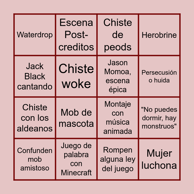 This bingo card has 16 words: Juego de palabra con Minecraft, "No puedes dormir, hay monstruos", Chiste de peods, Waterdrop, Chiste con los aldeanos, Escena Post-creditos, Montaje con música animada, Rompen alguna ley del juego, Jack Black cantando, Chiste woke, Confunden mob amistoso, Herobrine, Mob de mascota, Persecusión o huida, Jason Momoa, escena épica and Mujer luchona.
