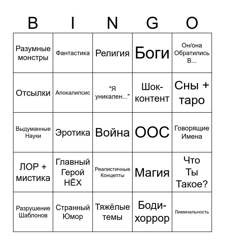 This bingo card has a free space and 24 words: Главный Герой НЁХ, Странный Юмор, "Я уникален...", Разрушение Шаблонов, Он/она Обратились В..., Разумные монстры, Отсылки, Фантастика, ООС, Реалистичные Концепты, Шок-контент, Выдуманные Науки, Магия, Что Ты Такое?, Апокалипсис, Боди-хоррор, Говорящие Имена, Религия, Сны + таро, Эротика, Лиминальность, ЛОР + мистика, Боги and Тяжёлые темы.