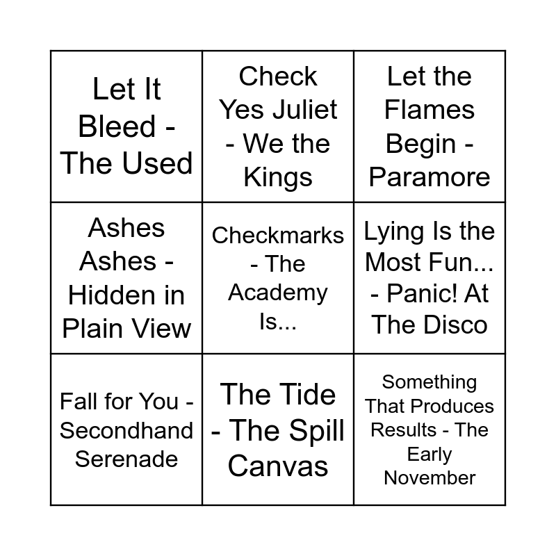 This bingo card has 21 words: Free!, Welcome to the Black Parade - My Chemical Romance, Check Yes Juliet - We the Kings, Miserable at Best - Mayday Parade, Ohio Is For Lovers - Hawthorne Heights, Fall for You - Secondhand Serenade, Let It Bleed - The Used, Let the Flames Begin - Paramore, Dez Moines - The Devil Wears Prada, The Tide - The Spill Canvas, Something That Produces Results - The Early November, Ashes Ashes - Hidden in Plain View, Baby, You Wouldn't Last a Minute on the Creek - Chiodos, Welcome Home - Coheed and Cambria, Lying Is the Most Fun... - Panic! At The Disco, Anthem of Our Dying Day - Story of the Year, I Caught Fire - The Used, Here (In Your Arms) - Hellogoodbye, Checkmarks - The Academy Is..., Hold Me Down - Motion City Soundtrack and Can't Be Saved - Senses Fail.