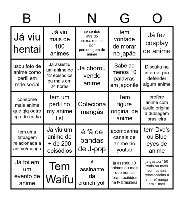 This bingo card has a free space and 24 words: Ja viu um anime de + de 200 episódios, Tem Waifu, Já chorou vendo anime, Já foi em um evento de anime, Já fez cosplay de anime, Já viu hentai, usou foto de anime como perfil em rede social, Já viu mais de 100 animes, Tem figure original de anime, é fã de bandas de J-pop, Sabe ao menos 10 palavras em japonês, consome mais anime que qlq outro tipo de mídia, acompanha canais de anime no youtub, tem Dvd's ou Blue eyes de anime, Ja assistiu um anime de 12 episódios ou mais em 24 horas, ja assistiu 10 animes ou mais que nunca foram exibidos na tv brasileira, prefere anime com audio original a dublagem brasileira, se sentou atraído sexualmente por personagem de anime, Discutiu na internet pra defender algum anime, tem um perfil no my anime list, ja gastou 150 reais ou mais com coisas relacionadas a anime/mangá em 1 mês, tem uma tatuagem relacionada a anime/mangá, tem vontade de morar no japão and é assinante da crunchryoll.