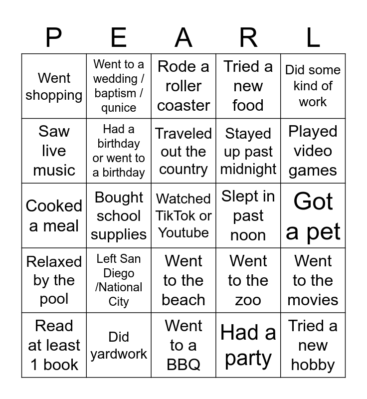 This bingo card has 25 words: Left San Diego /National City, Went to a BBQ, Traveled out the country, Read at least 1 book, Did some kind of work, Went shopping, Saw live music, Went to a wedding / baptism / qunice, Slept in past noon, Went to the beach, Stayed up past midnight, Cooked a meal, Went to the zoo, Went to the movies, Had a birthday or went to a birthday, Tried a new hobby, Got a pet, Rode a roller coaster, Played video games, Bought school supplies, Watched TikTok or Youtube, Did yardwork, Relaxed by the pool, Tried a new food and Had a party.
