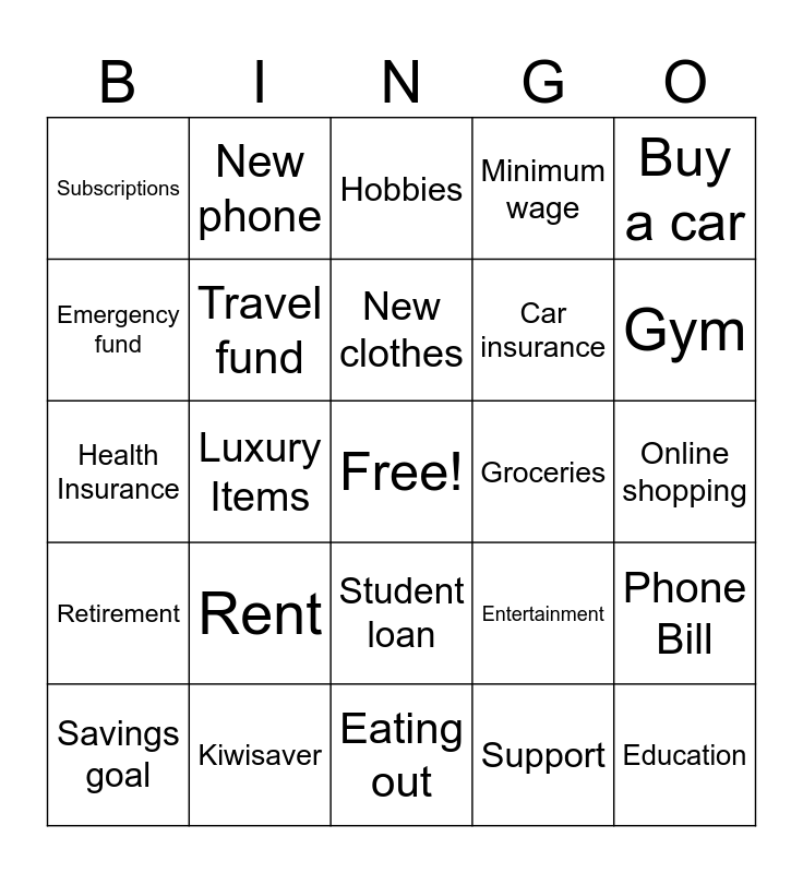 This bingo card has a free space and 25 words: Rent, Eating out, New clothes, Savings goal, Buy a car, Subscriptions, Emergency fund, New phone, Groceries, Student loan, Car insurance, Health Insurance, Entertainment, Phone Bill, Travel fund, Bills (Fixed), Online shopping, Hobbies, Gym, Luxury Items, Education, Kiwisaver, Retirement, Minimum wage and Support.