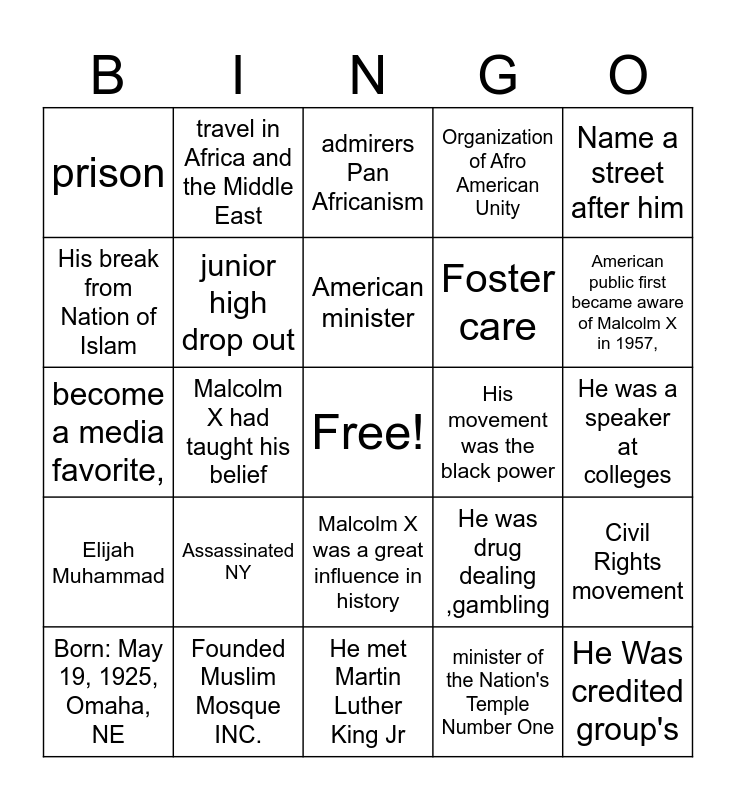 This bingo card has a free space and 25 words: Born: May 19, 1925, Omaha, NE, Assassinated NY, American minister, minister of the Nation's Temple Number One, American public first became aware of Malcolm X in 1957,, prison, travel in Africa and the Middle East, admirers Pan Africanism, Foster care, Civil Rights movement, become a media favorite,, junior high drop out, He was drug dealing ,gambling, He Was credited group's, His break from Nation of Islam, Founded Muslim Mosque INC., He met Martin Luther King Jr, Organization of Afro American Unity, He was a speaker at colleges, Elijah Muhammad, Malcolm X had taught his belief, Malcolm X was a great influence in history, His movement was the black power, Name a street after him and protestant minister.
