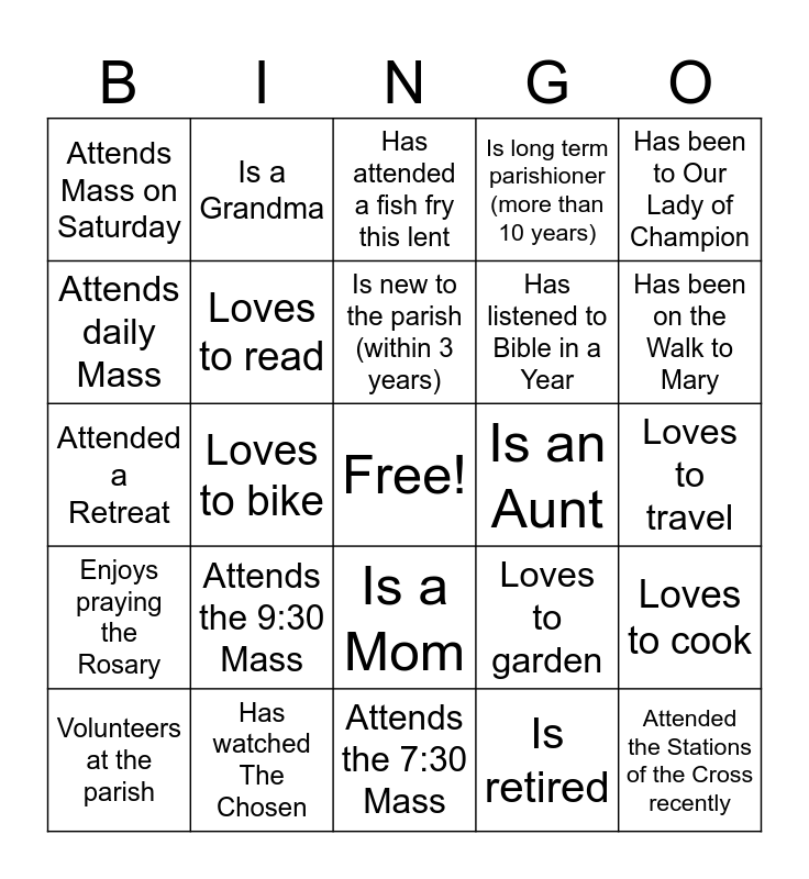 This bingo card has a free space and 24 words: Attends the 9:30 Mass, Has watched The Chosen, Is new to the parish (within 3 years), Volunteers at the parish, Has been to Our Lady of Champion, Attends Mass on Saturday, Attends daily Mass, Is a Grandma, Is an Aunt, Is a Mom, Has listened to Bible in a Year, Attended a Retreat, Loves to garden, Loves to cook, Loves to read, Is retired, Loves to travel, Has attended a fish fry this lent, Has been on the Walk to Mary, Loves to bike, Attended the Stations of the Cross recently, Enjoys praying the Rosary, Is long term parishioner (more than 10 years) and Attends the 7:30 Mass.