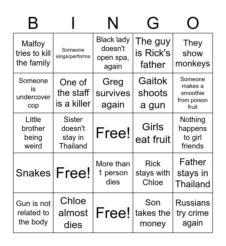 This bingo card has a free space and 24 words: Free!, Chloe almost dies, Greg survives again, Gun is not related to the body, They show monkeys, Malfoy tries to kill the family, Someone is undercover cop, Someone sings/performs, Girls eat fruit, More than 1 person dies, Gaitok shoots a gun, Little brother being weird, Rick stays with Chloe, Father stays in Thailand, One of the staff is a killer, Son takes the money, Nothing happens to girl friends, Black lady doesn't open spa, again, Someone makes a smoothie from poison fruit, Sister doesn't stay in Thailand, Russians try crime again, Snakes, The guy is Rick's father and Free!.