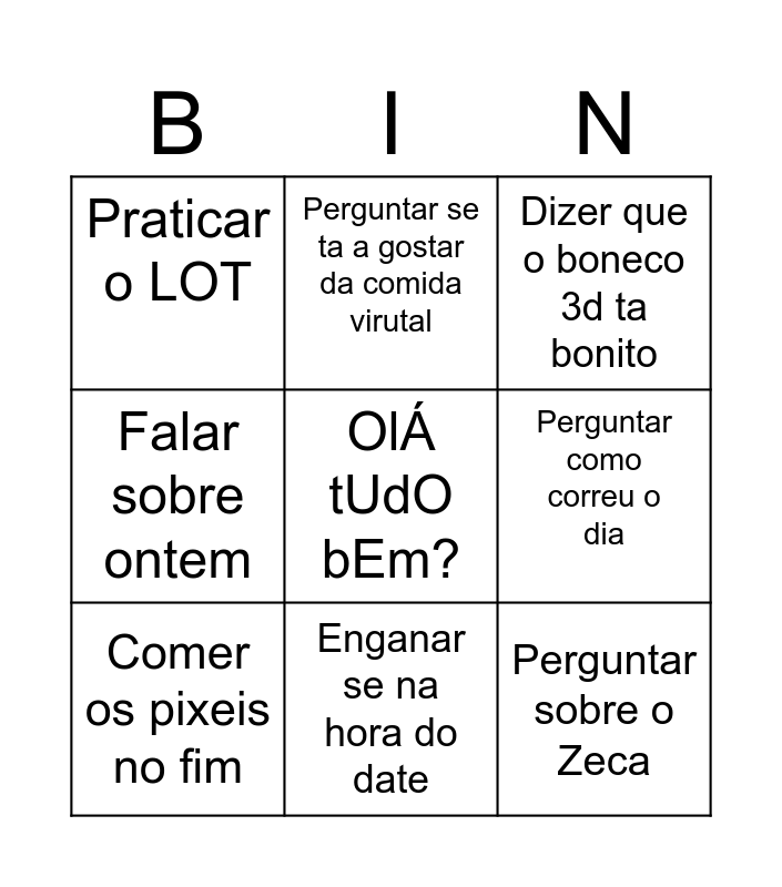 This bingo card has a free space and 8 words: Perguntar como correu o dia, Dizer que o boneco 3d ta bonito, Perguntar se ta a gostar da comida virutal, Comer os pixeis no fim, Praticar o LOT, Perguntar sobre o Zeca, Falar sobre ontem and Enganar se na hora do date.
