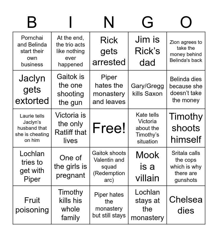 This bingo card has a free space and 24 words: Fruit poisoning, One of the girls is pregnant, Piper hates the monastery and leaves, Lochlan stays at the monastery, Zion agrees to take the money behind Belinda's back, Pornchai and Belinda start their own business, At the end, the trio acts like nothing ever happened, Rick gets arrested, Kate tells Victoria about the Timothy’s situation, Timothy shoots himself, Laurie tells Jaclyn’s husband that she is cheating on him, Gaitok is the one shooting the gun, Mook is a villain, Sritala calls the cops which is why there are gunshots, Jaclyn gets extorted, Timothy kills his whole family, Piper hates the monastery but still stays, Jim is Rick’s dad, Belinda dies because she doesn’t take the money, Lochlan tries to get with Piper, Victoria is the only Ratliff that lives, Gaitok shoots Valentin and squad (Redemption arc), Gary/Gregg kills Saxon and Chelsea dies.
