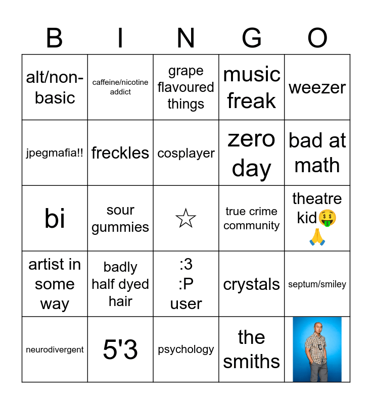 This bingo card has 1 images, a free space and 23 words: badly half dyed hair, 5'3, cosplayer, neurodivergent, weezer, alt/non-basic, jpegmafia!!, caffeine/nicotine addict, true crime community, :3 :P user, zero day, bi, crystals, septum/smiley, freckles, the smiths, theatre kid🤑🙏, grape flavoured things, bad at math, sour gummies, artist in some way, music freak and psychology.