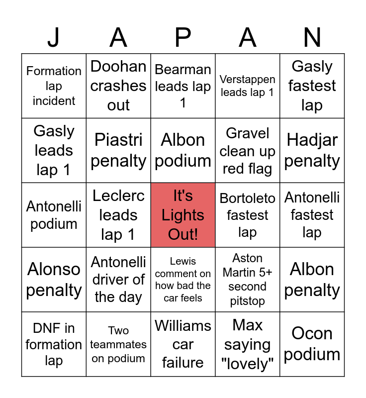 This bingo card has a free space and 206 words: Doohan penalty, Front wing replaced, Sainz crashes out, McLaren 5+ second pitstop, Hamilton fastest lap, Podium trophy breaks, DRS overtake on DRS activation lap, Hadjar crashes out, Red bull car failure, Doohan crashes out, AlphaTauri 5+ second pitstop, Hulkenberg leads lap 1, McLaren car failure, Hamilton penalty, Bortoleto leads lap 1, Verstappen crashes out, Albon driver of the day, Tsunoda penalty, Bortoleto driver of the day, Doohan driver of the day, Albon leads lap 1, Sainz leads lap 1, Doohan leads lap 1, "Hello crofty!", Two teammates on podium, Piastri penalty, Hadjar fastest lap, Verstappen Podium, Toto slams table, Leclerc driver of the day, Ferrari car failure, Red bull 5+ second pitstop, Russell fastest lap, Lawson penalty, Piastri driver of the day, Driver taps wall, Teammates wheel-to-wheel, Race switches from laps to timed, Verstappen driver of the day, Norris leads lap 1, Alpine car failure, Stroll leads lap 1, Haas 5+ second pitstop, Aston Martin 1-2, Pitlane incident investigation or penalty, Albon fastest lap, Gasly leads lap 1, Hulkenberg penalty, Ocon penalty, Time difference comment by commentators, Max leading 15+ second gap to P2, Gravel clean up red flag, Albon penalty, Haas car failure, Pitlane start, Lawson leads lap 1, First time race winner, Albon podium, Sainz driver of the day, Norris crashes out, Any driver: Only soft and mediums used, Gasly podium, Antonelli crashes out, Celebrity waves checkered flag, Verstappen penalty, Sauber 5+ second pitstop, Ferrari 5+ second pitstop, Hamilton crashes out, Alonso leads lap 1, Tsunoda podium, Antonelli fastest lap, Aston Martin car failure, Sainz penalty, Russell driver of the day, Alonso crashes out, Double Aussie points, Hadjar penalty, Racing Bulls car failure, Bearman penalty, Ocon driver of the day, Rain begins after race start, Gasly driver of the day, Aston Martin 5+ second pitstop, Hadjar podium, Ferrari: "we are checking", Leclerc crashes out, Alonso podium, Car on fire, Driver penalty for lining up incorrectly on grid, Mercedes 5+ second pitstop, Verstappen fastest lap, Sauber car failure, Russell crashes out, Red flag, Norris fastest lap, Time penalty served during race, Both teammates DNF, Spin in formation lap, Any driver: Only soft and hards used, Antonelli driver of the day, Russell penalty, Bearman leads lap 1, Hadjar leads lap 1, Bearman driver of the day, Any driver: Only mediums and hards used, Red Bull 1-2, "Two seconds, Ted", Piastri leads lap 1, Podium finishers sit in wrong chairs in cooldown room, First points achieved, Mercedes car failure, Teammates crash each other out, Lawson fastest lap, Tsunoda fastest lap, Grand Slam weekend achieved (Pole, Winner, Fastest Lap, and leads every lap of the race), Piastri fastest lap, Norris podium, Gasly fastest lap, Bearman crashes out, Antonelli penalty, Ex F1 driver leads post race interview, Alpine 5+ second pitstop, Piastri crashes out, Hamilton leads lap 1, Aussie driver podium, Stroll driver of the day, Ocon leads lap 1, Sainz comment on body pain/discomfort, Norris penalty, Sainz singing smooth operator, Max saying "lovely", Alonso fastest lap, Mercedes 1-2, Hadjar driver of the day, Ocon fastest lap, Ocon crashes out, Double stack pitstop, Bortoleto fastest lap, "What the **** is he doing?!?", Alpine 1-2, Lawson podium, Russell podium, Engineer told to shut up, Ferrari 1-2, Lewis comment on how bad the car feels, Sainz podium, Stroll podium, Pitlane collision, Car flips, Hulkenberg crashes out, Tsunoda driver of the day, First time podium achiever, Leclerc podium, Hamilton driver of the day, Lawson crashes out, Albon crashes out, Driver lap time deleted, Driver starts podium interview with “Yeah”, DNF in formation lap, Piastri podium, Tsunoda crashes out, Leclerc leads lap 1, Alonso driver of the day, Hulkenberg fastest lap, Alonso penalty, Tsunoda leads lap 1, Lawson driver of the day, Sainz fastest lap, “Incident will be investigated after the race”, Animal on track, "******!" And nothing else, Bortoleto crashes out, Commentary interrupted by team radio, Norris driver of the day, Lap 1 yellow flag, Williams 5+ second pitstop, Leclerc fastest lap, Russell leads lap 1, Stroll penalty, Stroll fastest lap, Hulkenberg driver of the day, "Press the red button on your controller if you're a SkySports or SkyGlass customer", Hamilton podium, Leclerc penalty, Gravel trap DNF, Verstappen: "the car felt good today", Team ordered swap, Ocon podium, Spin & continues, Stroll crashes out, Williams car failure, Hulkenberg podium, Formation lap incident, Bearman podium, Gasly penalty, Bortoleto podium, Any driver: All 3 compounds used, Verstappen leads lap 1, McLaren 1-2, Gasly crashes out, Antonelli podium, Antonelli leads lap 1, Doohan podium, Doohan fastest lap, Bearman fastest lap and Bortoleto penalty.