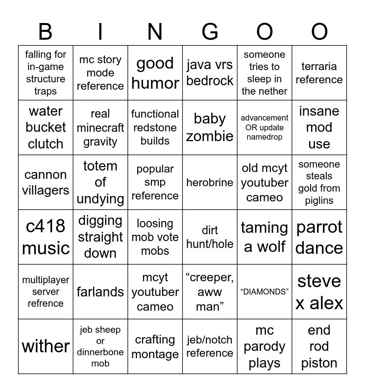 This bingo card has 36 words: “creeper, aww man”, mcyt youtuber cameo, jeb/notch reference, water bucket clutch, c418 music, herobrine, real minecraft gravity, crafting montage, someone tries to sleep in the nether, “DIAMONDS”, insane mod use, java vrs bedrock, steve x alex, totem of undying, baby zombie, falling for in-game structure traps, multiplayer server refrence, old mcyt youtuber cameo, cannon villagers, good humor, popular smp reference, digging straight down, dirt hunt/hole, loosing mob vote mobs, taming a wolf, mc story mode reference, advancement OR update namedrop, jeb sheep or dinnerbone mob, functional redstone builds, terraria reference, end rod piston, wither, parrot dance, someone steals gold from piglins, farlands and mc parody plays.