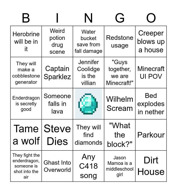 This bingo card has a free space and 24 words: Steve Dies, Ghast Into Overworld, Jennifer Coolidge is the villian, They fight the enderdragon, someone is shot into the air, Creeper blows up a house, Herobrine will be in it, They will make a cobblestone generator, Weird potion drug scene, Wilhelm Scream, They will find diamonds, "Guys together, we are Minecraft!", Enderdragon is secretly good, "What the block?", Parkour, Captain Sparklez, Jason Mamoa is a middleschool girl, Bed explodes in nether, Water bucket save from fall damage, Minecraft UI POV, Someone falls in lava, Dirt House, Tame a wolf, Redstone usage and Any C418 song.