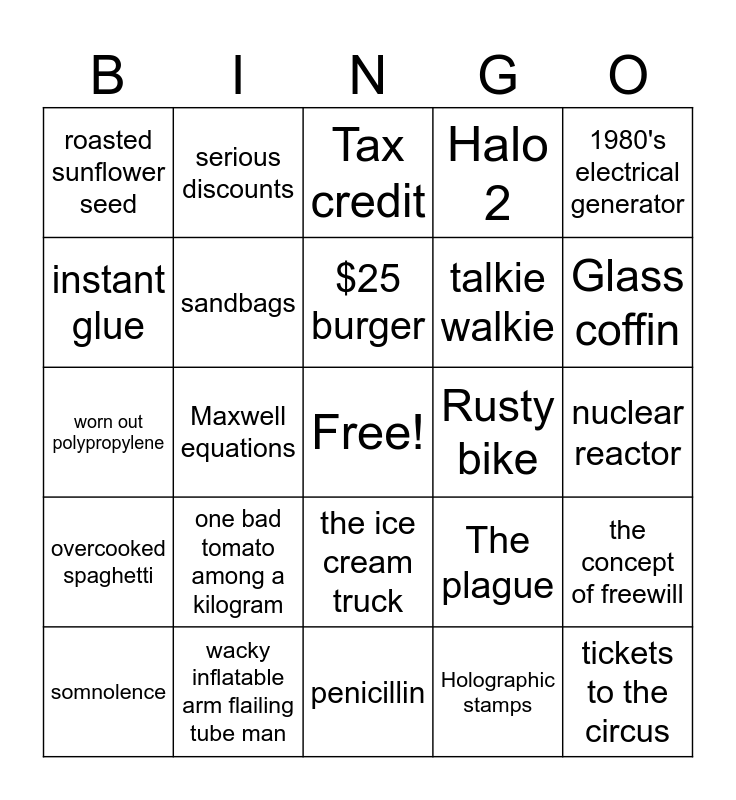 This bingo card has a free space and 24 words: one bad tomato among a kilogram, wacky inflatable arm flailing tube man, $25 burger, somnolence, 1980's electrical generator, roasted sunflower seed, instant glue, serious discounts, Rusty bike, the ice cream truck, talkie walkie, worn out polypropylene, The plague, the concept of freewill, sandbags, Holographic stamps, nuclear reactor, Tax credit, Glass coffin, Maxwell equations, tickets to the circus, overcooked spaghetti, Halo 2 and penicillin.