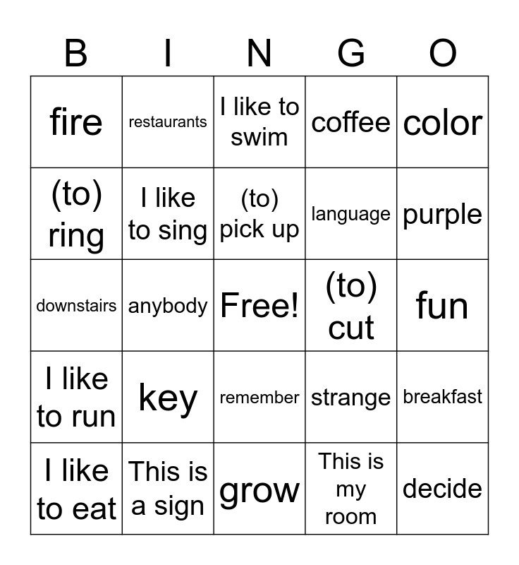 This bingo card has a free space and 28 words: breakfast, I like to dance, language, This is my room, (to) ring, I like to swim, restaurants, I like to run, (to) cut, I like to eat, downstairs, coffee, This is a sign, grow, purple, I like to game, key, I like to sing, (to) pick up, remember, fire, I like to paint, decide, anybody, fun, strange, color and olive.