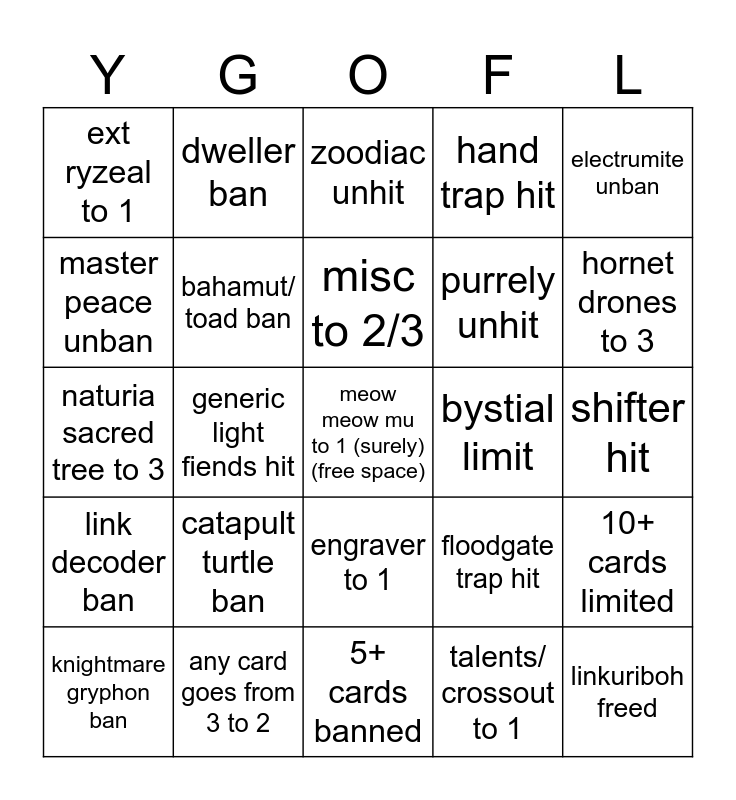 This bingo card has a free space and 24 words: catapult turtle ban, any card goes from 3 to 2, misc to 2/3, knightmare gryphon ban, electrumite unban, ext ryzeal to 1, master peace unban, dweller ban, bystial limit, engraver to 1, purrely unhit, naturia sacred tree to 3, floodgate trap hit, 10+ cards limited, bahamut/ toad ban, talents/ crossout to 1, shifter hit, zoodiac unhit, hornet drones to 3, generic light fiends hit, linkuriboh freed, link decoder ban, hand trap hit and 5+ cards banned.