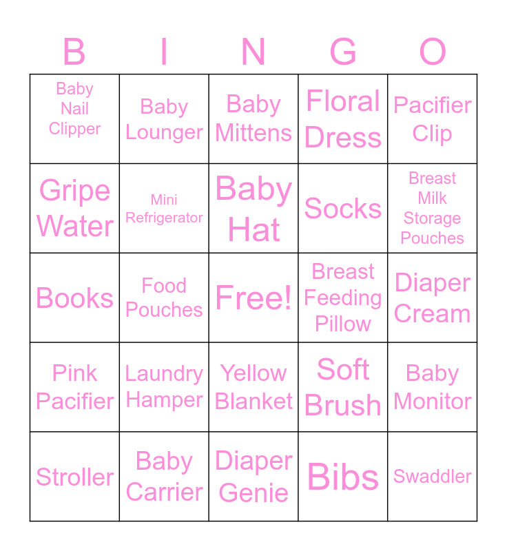 This bingo card has a free space and 54 words: Rattle, Pink Pacifier, Bottle Warmer, Potty, Yellow Blanket, Baby Yoda Onesie, Floral Dress, Wash Cloths, Gripe Water, Baby Robe, Baby Nail Clipper, Bassinet, Baby Carrier, Stroller, Play Pin, Diaper Genie, Swaddler, Socks, Anti- Colic Baby Bottles, Diaper Cream, Soft Brush, Colorful Head Bands, Breast Feeding Pillow, Pacifier Clip, Baby Jewelry, Baby Lounger, Car Seat, Diaper Bag, Baby Tub, Bibs, Dove Baby Wash, Johnson Johnson Lotion, Dreft Laundry Detergent, Baby Bath Sponge, Baby Mittens, Car Seat Cover, Books, Baby Monitor, Humidifier, Mini Refrigerator, Nursing Cover, Teether, Cabinet Locks, Socket Plug Covers, Laundry Hamper, Storage Cart, Baby Mobile Hanger, White Noise Maker, Baby Hat, Food Pouches, Breast Milk Storage Pouches, Shopping Cart Cover, Baby Gate and Baby Toothbrushes.