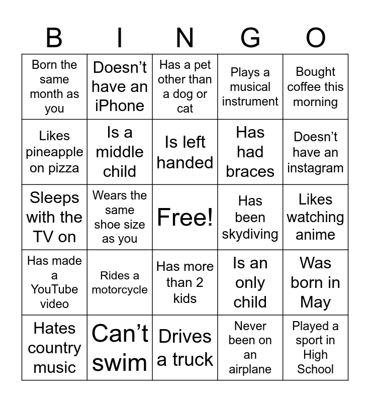 This bingo card has a free space and 24 words: Rides a motorcycle, Can’t swim, Is left handed, Hates country music, Bought coffee this morning, Born the same month as you, Likes pineapple on pizza, Doesn’t have an iPhone, Has been skydiving, Has more than 2 kids, Has had braces, Sleeps with the TV on, Is an only child, Was born in May, Is a middle child, Never been on an airplane, Likes watching anime, Has a pet other than a dog or cat, Doesn’t have an instagram, Wears the same shoe size as you, Played a sport in High School, Has made a YouTube video, Plays a musical instrument and Drives a truck.