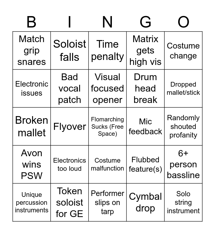 This bingo card has a free space and 29 words: Unique percussion instruments, Pulse wins PIW, Flyover, Wind soloist, Match grip snares, Time penalty, Bad vocal patch, Electronics too loud, Mic feedback, Token soloist for GE, Randomly shouted profanity, Solo string instrument, Performer slips on tarp, Cymbal drop, Dropped mallet/stick, Bad sample timing, Costume malfunction, Avon wins PSW, Costume change, Broken mallet, Flubbed feature(s), Drum falls off of carrier, Drum head break, Electronic issues, Matrix gets high vis, Soloist falls, 6+ person bassline, Visual focused opener and Giant props.
