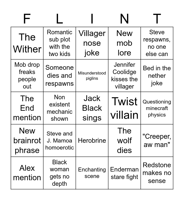 This bingo card has a free space and 24 words: Steve and J. Mamoa homoerotic, Black woman gets no depth, Misunderstood piglins, Alex mention, Steve respawns, no one else can, The Wither, Mob drop freaks people out, Romantic sub plot with the two kids, Twist villain, Herobrine, Jennifer Coolidge kisses the villager, The End mention, The wolf dies, "Creeper, aw man", Someone dies and respawns, Enderman stare fight, Questioning minecraft physics, Villager nose joke, Bed in the nether joke, Non existent mechanic shown, Redstone makes no sense, New brainrot phrase, New mob lore and Enchanting scene.