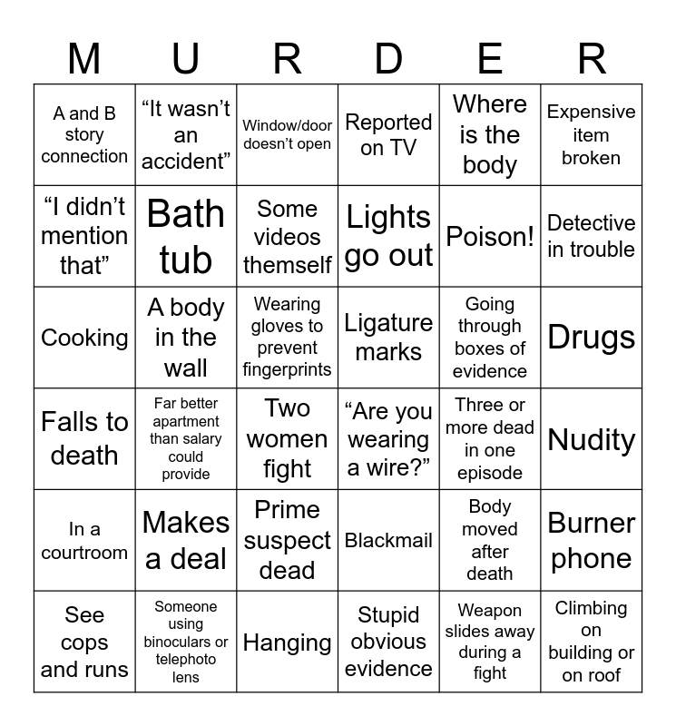This bingo card has 36 words: Blackmail, Prime suspect dead, Stupid obvious evidence, “I didn’t mention that”, Falls to death, Ligature marks, Bath tub, Hanging, Where is the body, Body moved after death, Detective in trouble, Reported on TV, Burner phone, A body in the wall, Lights go out, A and B story connection, In a courtroom, Going through boxes of evidence, Cooking, Window/door doesn’t open, Wearing gloves to prevent fingerprints, Far better apartment than salary could provide, “Are you wearing a wire?”, Two women fight, Three or more dead in one episode, “It wasn’t an accident”, Poison!, Someone using binoculars or telephoto lens, Some videos themself, Expensive item broken, Climbing on building or on roof, See cops and runs, Nudity, Drugs, Makes a deal and Weapon slides away during a fight.