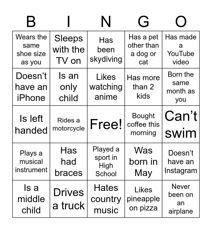 This bingo card has a free space and 24 words: Has had braces, Drives a truck, Likes watching anime, Is a middle child, Has made a YouTube video, Wears the same shoe size as you, Doesn’t have an iPhone, Sleeps with the TV on, Bought coffee this morning, Played a sport in High School, Has more than 2 kids, Is left handed, Was born in May, Doesn’t have an Instagram, Is an only child, Likes pineapple on pizza, Can’t swim, Has been skydiving, Born the same month as you, Rides a motorcycle, Never been on an airplane, Plays a musical instrument, Has a pet other than a dog or cat and Hates country music.