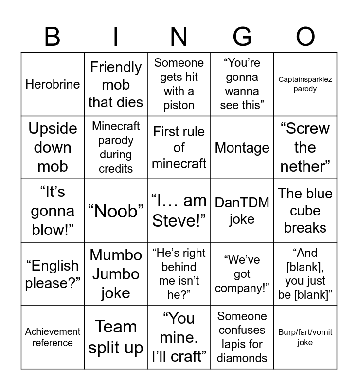 This bingo card has a free space and 24 words: Mumbo Jumbo joke, Team split up, First rule of minecraft, Achievement reference, Captainsparklez parody, Herobrine, Upside down mob, Friendly mob that dies, DanTDM joke, “He’s right behind me isn’t he?”, Montage, “It’s gonna blow!”, “We’ve got company!”, “And [blank], you just be [blank]”, Minecraft parody during credits, Someone confuses lapis for diamonds, The blue cube breaks, Someone gets hit with a piston, “Screw the nether”, “Noob”, Burp/fart/vomit joke, “English please?”, “You’re gonna wanna see this” and “You mine. I’ll craft”.