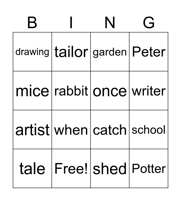 This bingo card has 25 words: story, famous, writer, interview, mice, drawing, rabbit, tailor, Free!, England, artist, catch, jacket, tail, once, loaf, shed, garden, when, school, tale, Beatrix, Potter, Peter and Nutkin.