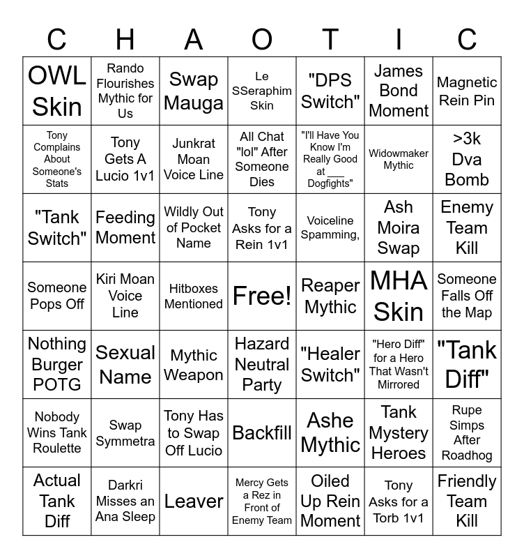 This bingo card has a free space and 80 words: Someone Complains About a Hero Pick, Swap Symmetra, Swap Mauga, Tank Mystery Heroes, DPS Mystery Heroes, Widow Swaps Sombra, "Tank Diff", "Hero Diff", "Hero Diff" for a Hero That Wasn't Mirrored, Actual Tank Diff, MHA Skin, ATLA Skin, Le SSeraphim Skin, OWL Skin, OW1 Skin, James Bond Moment, Sexual Name, Wildly Out of Pocket Name, Someone Says a Slur, "Tank Switch", "Healer Switch", "DPS Switch", All Chat "lol" After Someone Dies, Tony Complains About Someone's Stats, Magnetic Rein Pin, Oiled Up Rein Moment, Darkri Misses an Ana Sleep, Mercy Gets a Rez in Front of Enemy Team, Mercy Pocket, Enemy Team Recurring Character, Junkrat Moan Voice Line, Juno Moan Voice Line, Kiri Moan Voice Line, Friendly Team Kill, Enemy Team Kill, >3k Dva Bomb, Lifeweaver Neutral Party, Mei Neutral Party, Hazard Neutral Party, Widowmaker Mythic, Reaper Mythic, Ashe Mythic, Rein Mythic, Zen Mythic, Mythic Weapon, Rando Flourishes Mythic for Us, Someone Falls Off the Map, Nothing Burger POTG, Wrong POTG, Sombra Highlight Intro, Ash Moira Swap, "I'll Have You Know I'm Really Good at ___ Dogfights", Voiceline Spamming,, Tradeoff Moment, "What Did I Do??" POTG, Rando Instalocks Someone's Hero, Nobody Wins Tank Roulette, 10+ Minute Queue, Tony Asks for a Torb 1v1, Tony Asks for a Rein 1v1, Tony Gets A Lucio 1v1, Tony Gets to Lucio on Lijiang Garden, Tony Gets to Ball on Lijiang Garden, Someone Gets to Lucio on Ilios, Darkri Loses the Rein 1v1, Darkri's Frames Die After Multiple Games, Ash Gets Tank, Insta-Lock Mercy, Tony Has to Swap Off Lucio, "I'm Dead Here" Doesn't Die, Feeding Moment, Someone Pops Off, We Get a Game Immediately After Someone Calls Out Queue Time, Leaver, Backfill, Tanks Share a Brain Cell, Hitboxes Mentioned, Politics Mentioned, Rupe Simps After Roadhog and Someone Dies to a Dva Bomb.