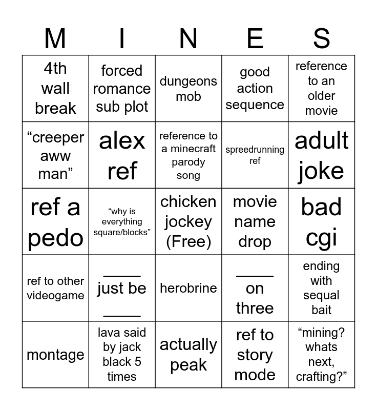 This bingo card has a free space and 24 words: ____ just be ____, lava said by jack black 5 times, reference to a minecraft parody song, montage, reference to an older movie, 4th wall break, “creeper aww man”, forced romance sub plot, movie name drop, herobrine, spreedrunning ref, ref a pedo, ____ on three, ending with sequal bait, alex ref, ref to story mode, bad cgi, dungeons mob, adult joke, “why is everything square/blocks”, “mining? whats next, crafting?”, ref to other videogame, good action sequence and actually peak.